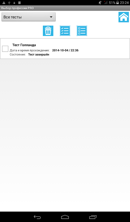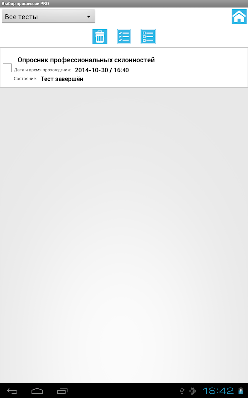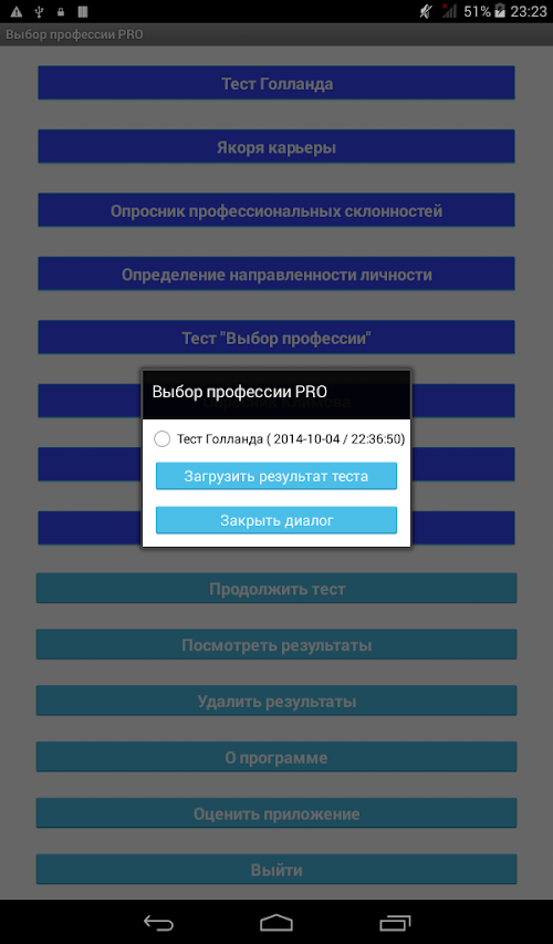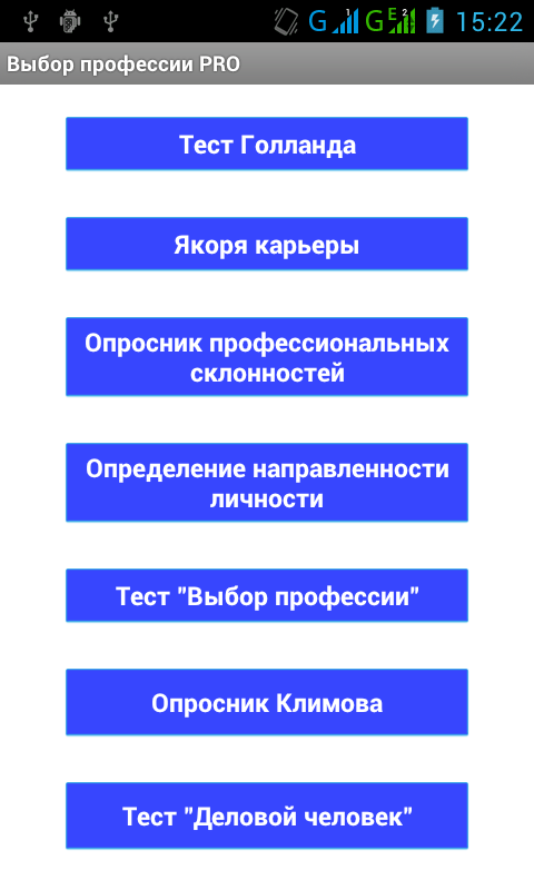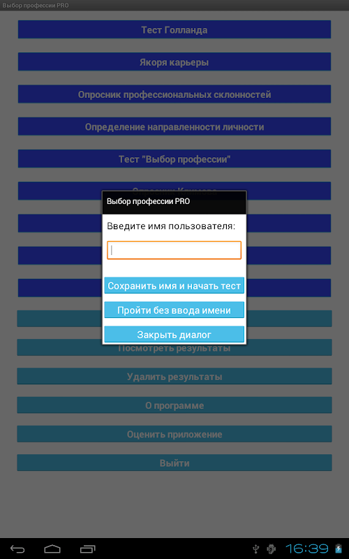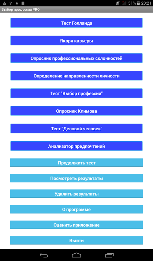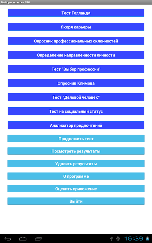 The application contains nine test (Holland, "The choice of profession," questionnaire Klimov et al.).