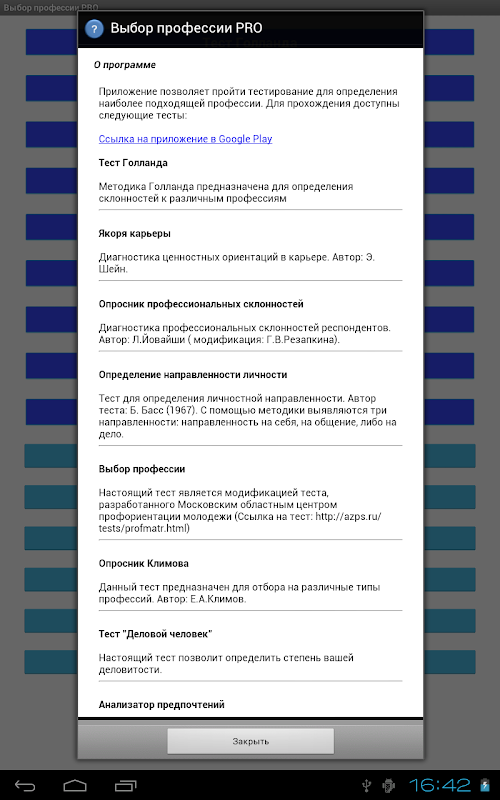 Приложение содержит девять тестов (Тест Голланда, "Выбор профессии", опросник Климова и др.).