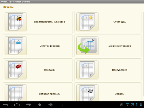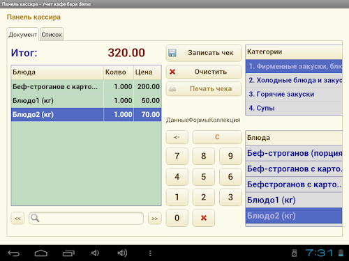 ВКонтакте : https://vk.com/mobile1cThe demo version of the program to take into account in a cafe or bar. The system is currently under development but you can always connect us to test and give feedback on the program or to help improve it. Can ask questions to the post office or post [email protected] suggestions.