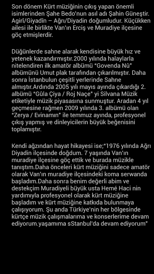You can find all of the things about Şahe Bedo. You can listen to his songs, see his photos and the other things about Şahe Bedo.