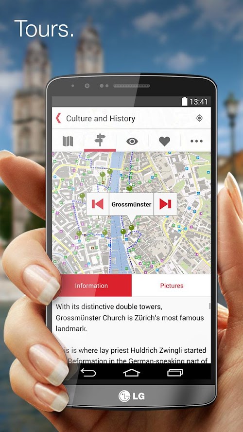 You can explore the city on your own through various exciting tours based on text and images. Information about public transport ensures that you won’t get lost! You will also find all the information you need via the integrated full text search.