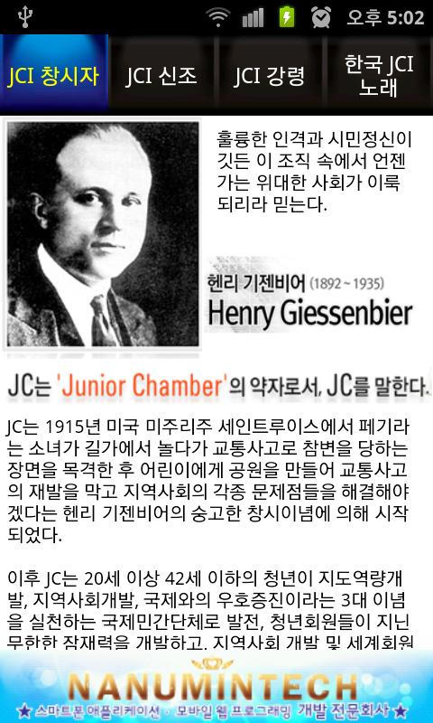 Association, the Junior Chamber of Commerce (South Korea South Korea JC) marks the 60th anniversary of its founding in 2012, while South Korea since the war, to go through a lot of upheaval, the future of the country, the responsibility of a young man with a sense of duty 'for a better future for the youth of the role has been faithfully. Korean JC emissions a number of young entrepreneurs, the roaring engines of economic growth and political and social development of the Republic of Korea has led youth leaders through the Korean JC grown. JC 60 years of South Korea is a history of the development of the Republic of Korea.