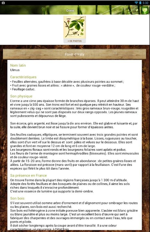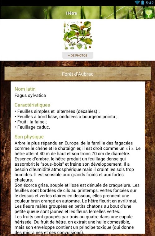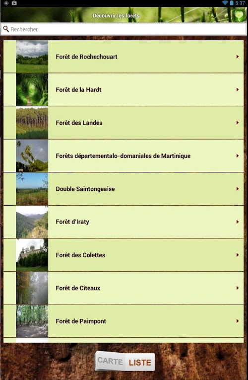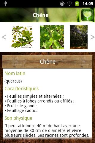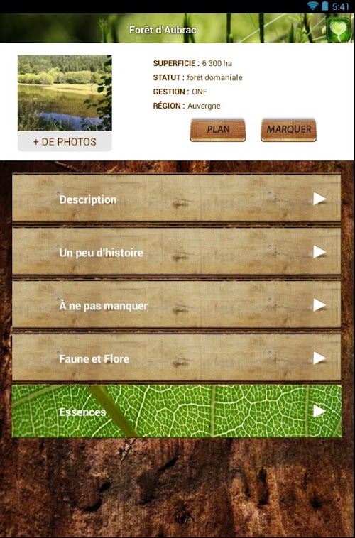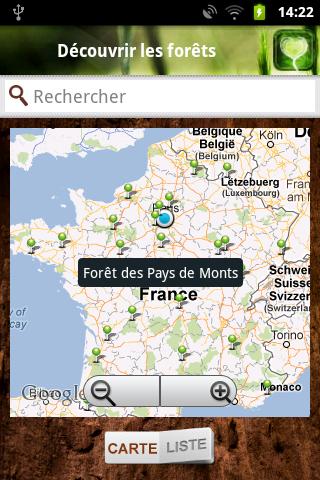 Toujours dans votre poche, il est possible de connaître immédiatement la forêt la plus proche de l’endroit où vous vous trouvez, d’en découvrir son histoire, sa flore et sa faune et les lieux et sites intéressants qui se trouvent à proximité et que nous vous conseillons de visiter. Pour vous permettre d’appréhender la flore qui vous entoure, des fiches très documentées sur les essences présentes dans la forêt vous sont offertes.