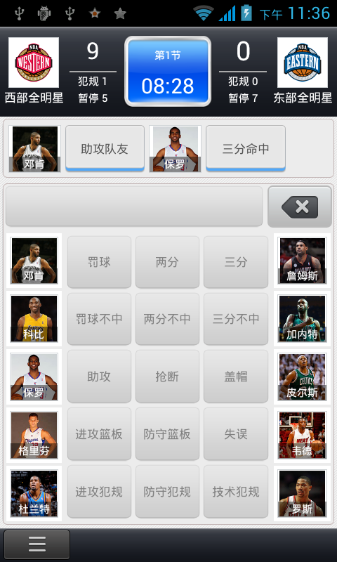 6. 比賽過程中隨時可以參考數據統計,球隊的或者個人的都可以看的到。球隊支持兩隊的數據對比,比賽過程中的優劣一目了然,大家可以針對的調整比賽策略,不在沒高人指點的情況下,無所適從。