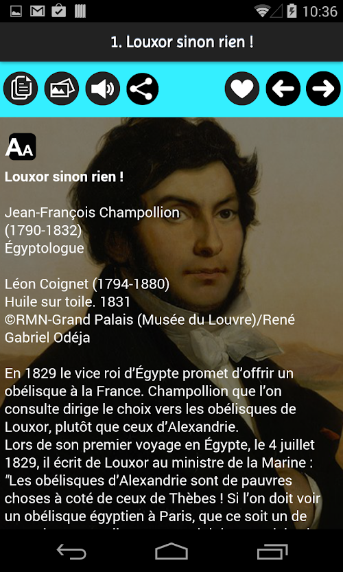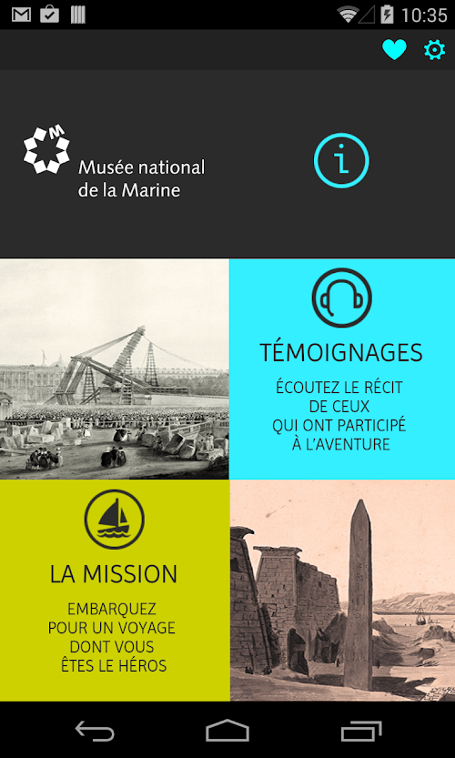 L’application officielle dédiée à l’exposition "le voyage de l’obélisque" du 12 février au 6 juillet 2014 présentée au musée national de la Marine vous propose de remonter le temps. Au cœur de l’exposition pour enrichir votre visite, des témoins du voyage vous racontent cette incroyable aventure, à travers de nombreux récits audio.