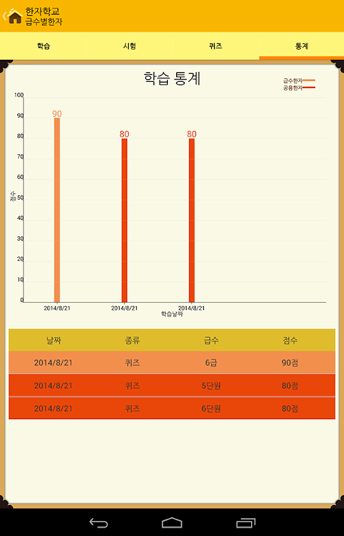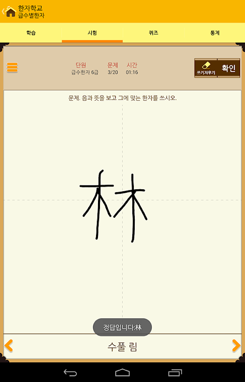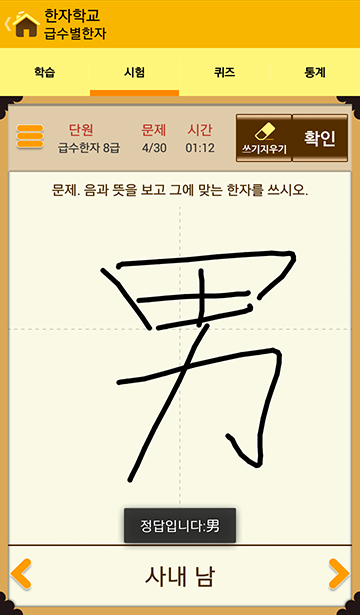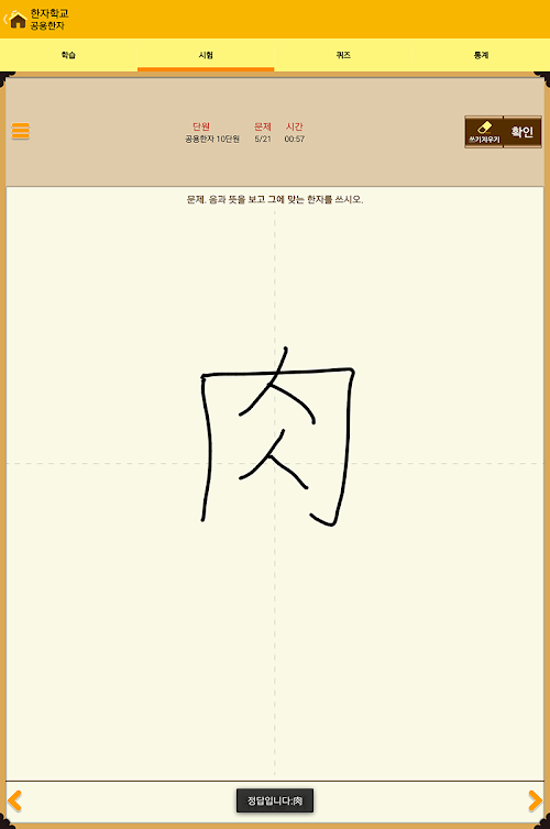시험 문제의 한자를 써보고 확인버튼을 누르면