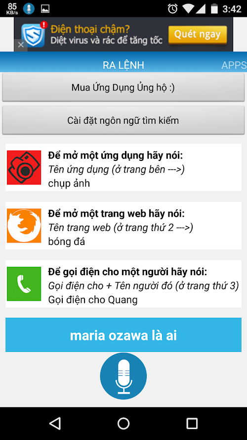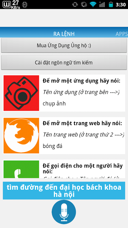 Ứng dụng chỉ chạy được khi máy có hỗ trợ tìm kiếm bằng giọng nói. Một số chức năng có thể chưa chạy được do mình chưa test được tất cả các dòng máy.