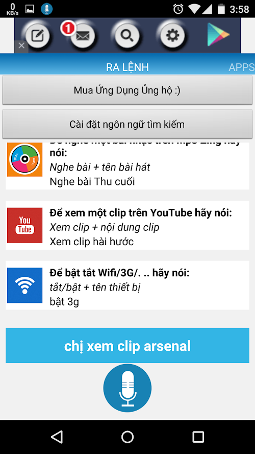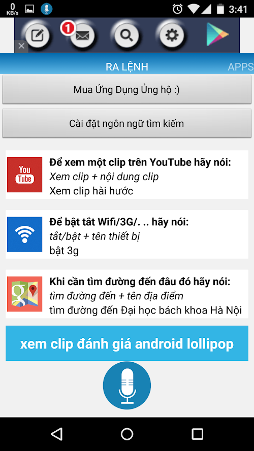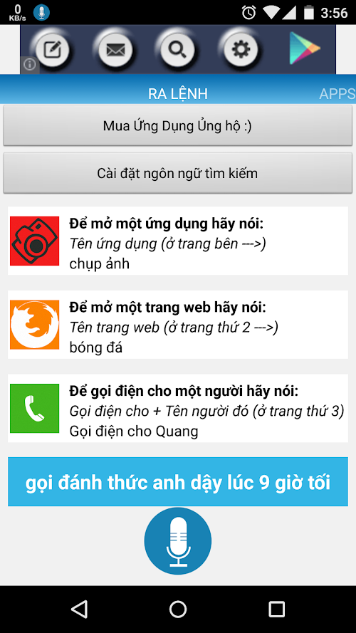 ĐỂ SỬ DỤNG ĐƯỢC TÍNH NĂNG NHẬN DIỆN GIỌNG NÓI CỦA GOOGLE CÁC BẠN CÀI THÊM "Voice Search" GOOGLE: https://play.google.com/store/apps/details?id=com.google.android.voicesearch