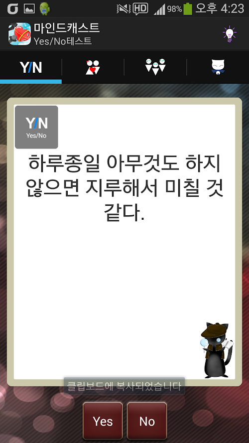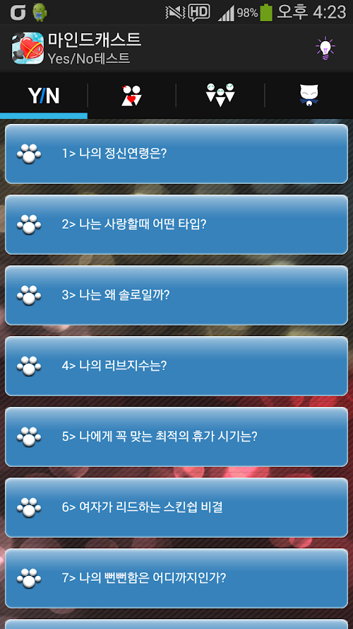혈액형&별자리, 성격&우정, 행동&전생, IQEQ, 기타 등으로 나뉘어져 간단한 심리테스트가 들어있습니다.