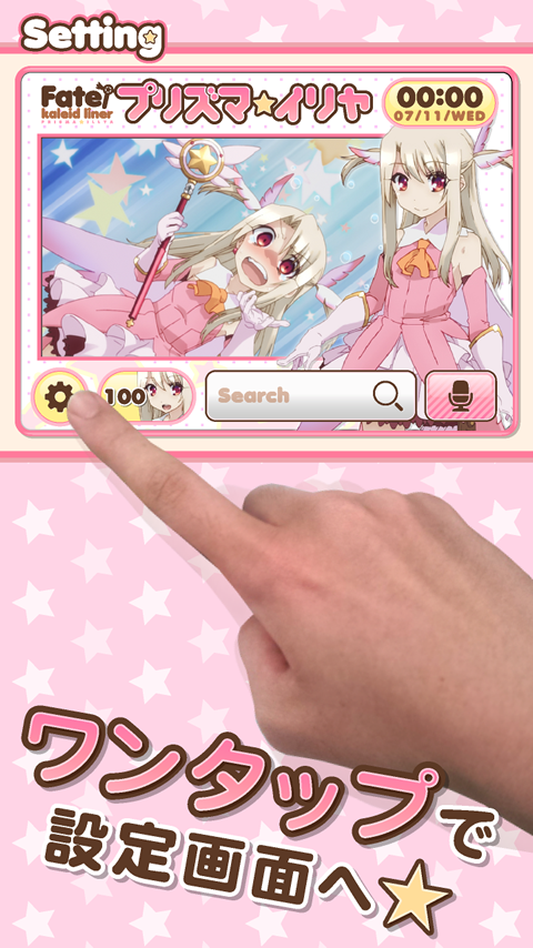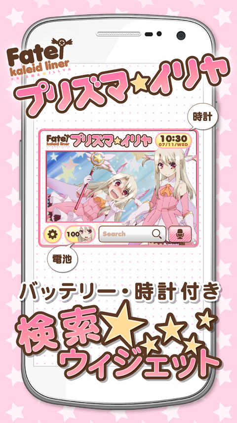 (c)2013 ひろやまひろし・TYPE-MOON・角川書店/「プリズマ☆イリヤ」製作委員会Official search widget popular serialized in a monthly Comp Ace "Prisma ☆ Ilya" comes up! Search widget convenient clock and battery function has also been equipped with search function that allows web search at any time, of course, and home screen installation and free delivery what! The ♪ Let the custom by a combination of characters and background image can be changed ♪ favorite one-tap and character of the widget