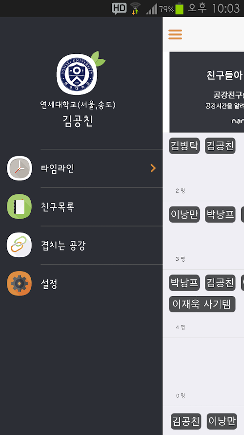 5. 회원님들의 연락처에 있는 같은 학교 공친 회원님들로 친구목록 생성됩니다.