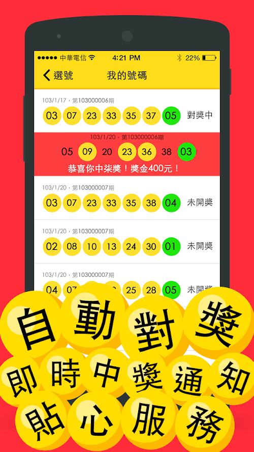 支援當期、多期及無限期對獎功能。將選好的號碼存進「樂透囉!」APP,開獎即時通知中獎與否好貼心。(需打開推播通知權限)