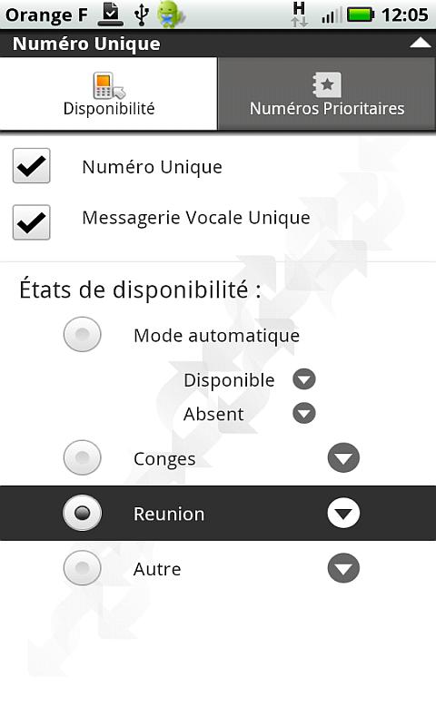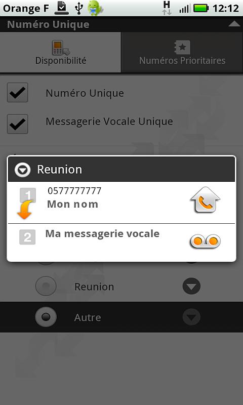 En effet, grâce au service Numéro Unique, un utilisateur disposant de plusieurs terminaux (fixe et mobile) n'aura plus qu'à communiquer sur un seul numéro. En fonction de son état de disponibilité, ses appels seront renvoyés vers ses différents terminaux, vers l'un de ses collègues ou vers sa messagerie vocale unique. Grâce à son interface mobile, l'utilisateur du Numéro Unique d'Orange Business Services pourra modifier à tout moment son état de disponibilité, en toute simplicité.This application is reserved to business market customers who have subscribed for Business Applications or Talk Business Talk package provides Orange Business Services.