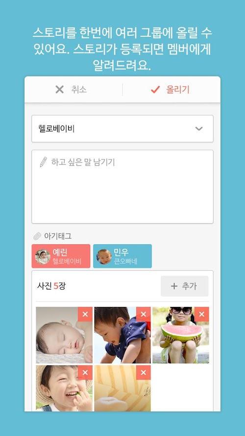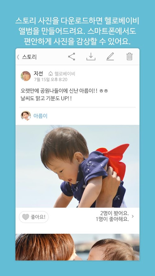 - 정말 좋아요! 아기 태어나고 양가 부모님과 형제들에게 메신저로 아기사진 보내는게 번거로왔었는데 한방에 해결해주네요! 부모님들이 잠금화면에서 아기사진을 볼 수 있다고 좋아하세요. 저도 한번만 사진 올리면 되고.. 이래저래 해피한 앱이네요~