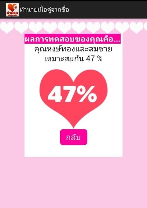 การทำนายดวงสมพงษ์เนื้อคู่จากชื่อ หรือ การทำนายเนื้อคู่ จากชื่อนั้น ในสมัยโบราณนั้น ใช้ในการดูว่า คู่รักที่กำลังจะแต่งงานกันจะดวงสมพงษ์กันไหม จะอยู่กันยืดยาว หรือจะดีร้ายอย่างไร บางคู่หากดวงไม่สมพงษ์หรืออาจจะไม่ใช่ เนื้อคู่กัน กันนั้นอาจจะต้องมีการแก้เคล็ดอีกด้วยBy Blogger Simply enter your name to the person you would predict that, you can. Cheats by then.