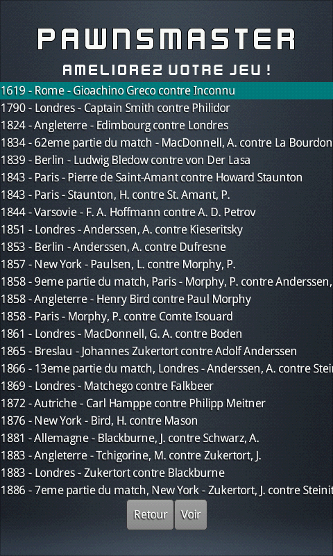 Téléchargez l'application et profitez des parties d'échecs commentées présentes sur www.pawnsmaster.com directement sur votre mobile !Pawnsmaster: Over 800 parts of chess commentary!