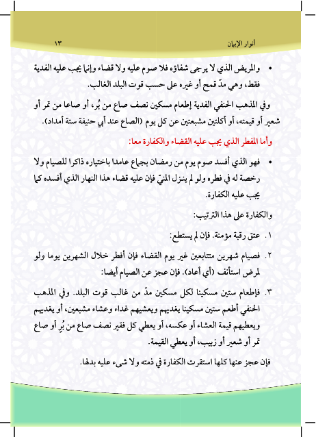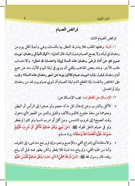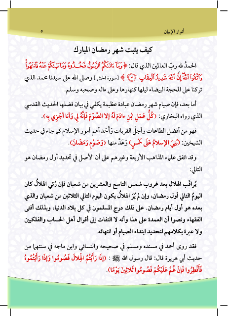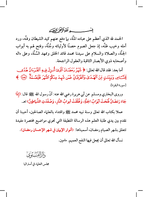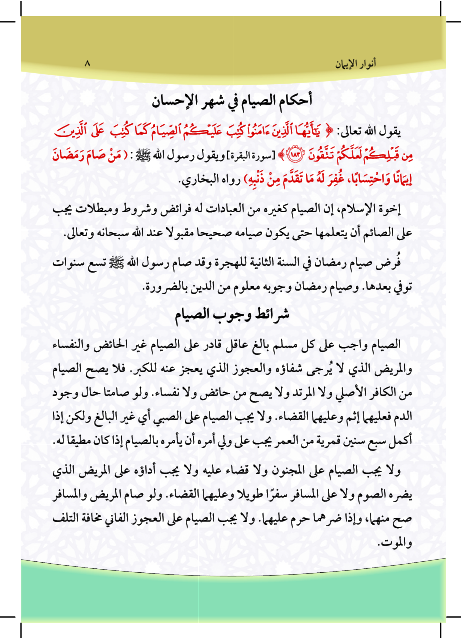 أنوار الإيمان في شهر الإحسان رمضان هو كتاب باللغتين العربية والإنكليزية شامل لمعظم المعلومات الشرعية المتعلقة بشهر رمضان المبارك. هذا الكتاب يشمل الدروس التالية: كيفية ثبوت شهر رمضان، بيان أحكام الصيام، شرائط وجوب الصيام، فرائض الصيام، مفسدات الصيام، ما يجب على المفطر عامدا في رمضان، المستحبات في الصيام، أقسام الردة، ليلة القدر، زكاة الفطر، مصارف الزكاة الشرعية، عيد الفطر المبارك،The Messenger of Allah may Allah bless him and his family and Oualh him "Whoever fasts Ramadan out of faith and hope of reward will be forgiven his previous sins." Bukhari. And Allah accept your fasting and Taatkm.
