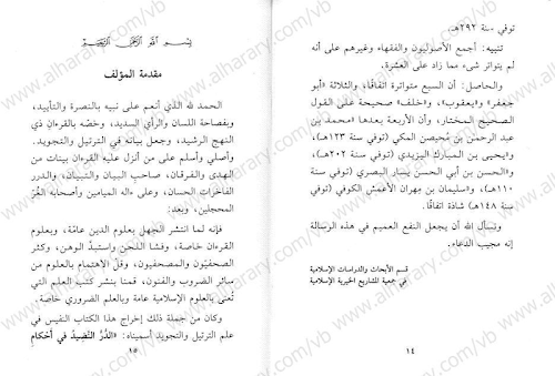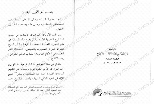 لما فشا اللحن واستبد الوهن وابتدع بعض قرّاء زماننا شيئًا يسمى بـ"التطريب" وهو الترنّم بالقراءة حيث يمدّ في غير محل المدّ ويزيد في المدّ ما لم تجِزْهُ العربية، حرصنا على اخراج هذا الكتاب النفيس في علم الترتيل والتجويد (الذي هو فرض كفاية) بغرض تعليم الناس التلاوة على النهج الذي أُنزل فيه.As revealed by the melody and flipped weakness and invented some of the readers of our time something called "elongation" which of singing reading where extends the non replace Tide increases in tidal unless Tdzh Arabic, keen to bring this precious book in the science of singing and intonation (which is a communal obligation) for the purpose of education People recitation of the approach, which was revealed in it.