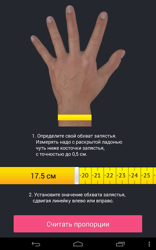1. Измеряем обхват кисти. Пример: 16,5 см.