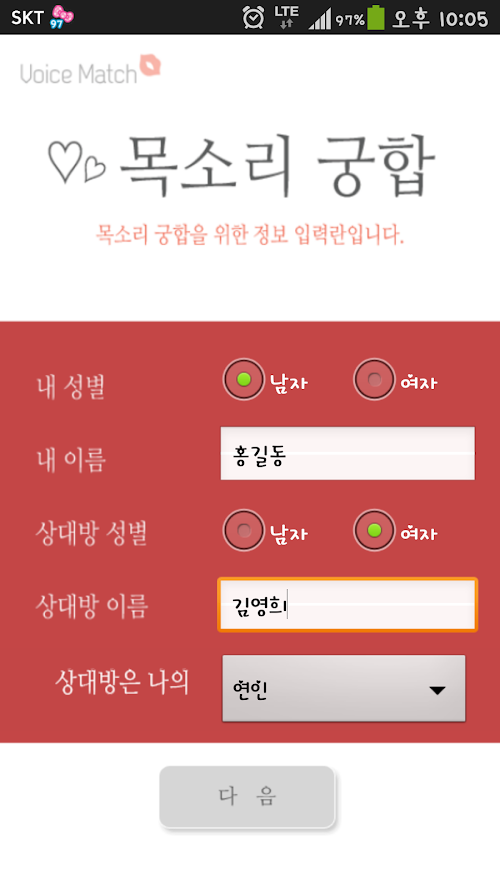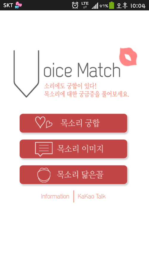 보이스매치는 목소리 녹음을 통해 목소리를 매치하여 궁합, 이미지, 닮은꼴을 확인할 수 있는
