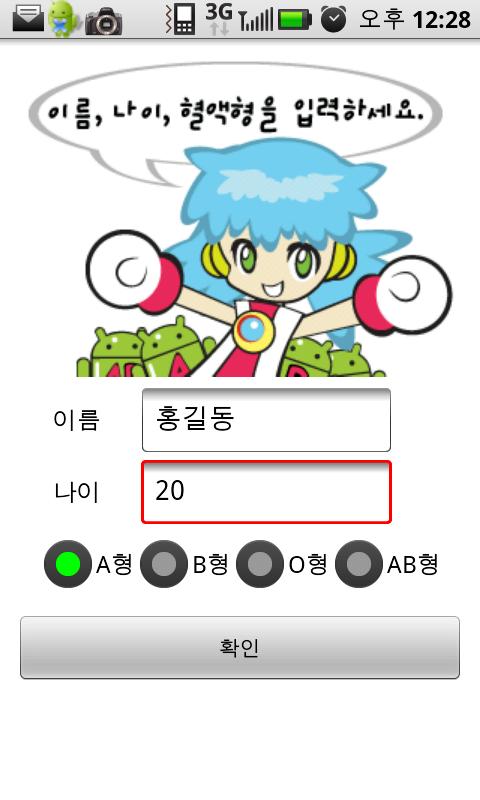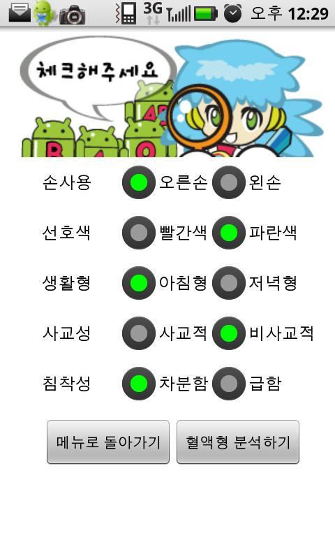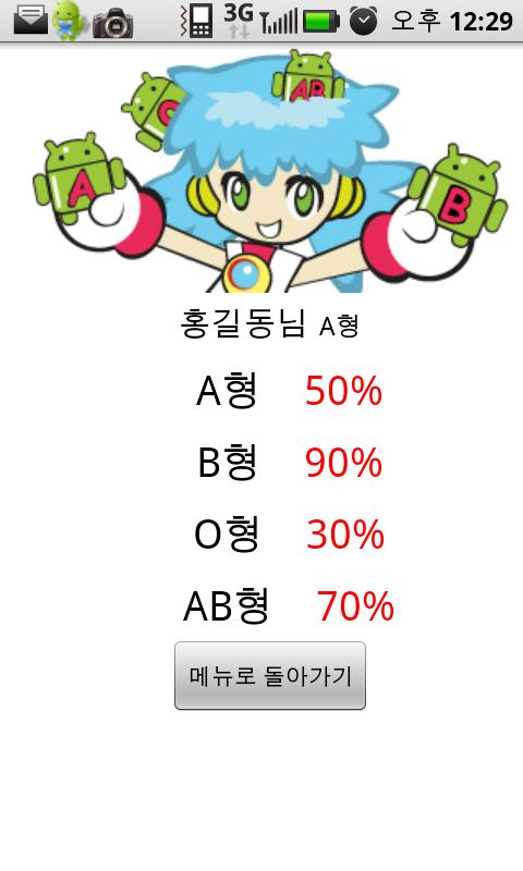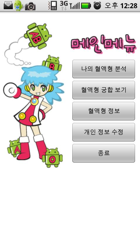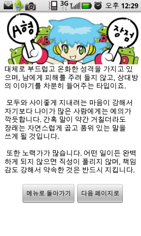 1.귀여운 캐릭터가 진행하는 당신의 혈액형과 나이 그리고 성격등 다양한 정보를 기초한 혈액형별 성격분석.
