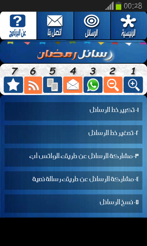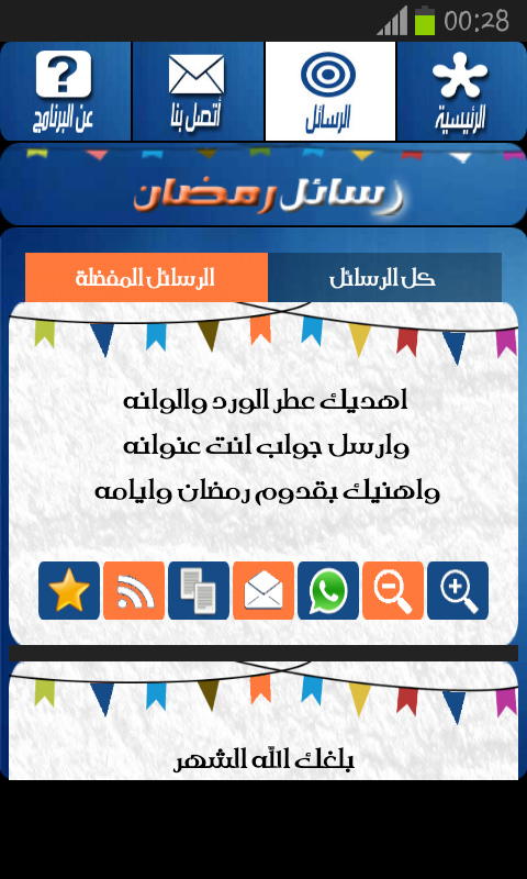 بمناسبة اقتراب حلول شهر رمضان المبارك 2013 اقدم لكم برنامج لارسال رسائل و مسجات رمضانية الى اصدقائكم و اهلكم و احبابكم . يحتوي البرنامج على اكثر من 200 رسالة مع امكانية ارسال الرسائل عن طريق الوسائط المتعددة (Facebook , What's App , Text message). من فضلك قم بالتقييم اذا اعجبك البرنامج.On the occasion of the approach of the holy month of Ramadan 2013 offer you a program for sending messages and Ramadan Msjat to your friends and kinsfolk and Ahbabikm. Please assessment of whether you like the program.