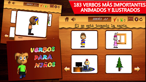 "Children Verbs" -Verbs for Kids has 183 animated and illustrated in cartoon format 3D high quality verbs. The application contains the most important verbs (100 animated and 83 shown) with audio and sound effects appropriate. The goal is to learn to use the verbs both phrases and sentences The second purpose is to develop vocabulary skills, talking with subject and verb. and learn the language.