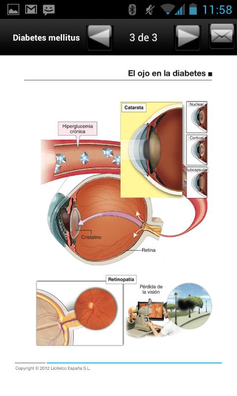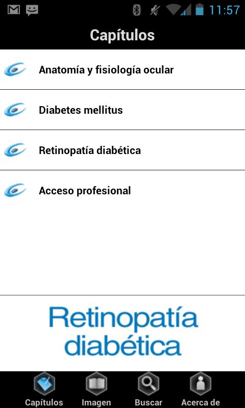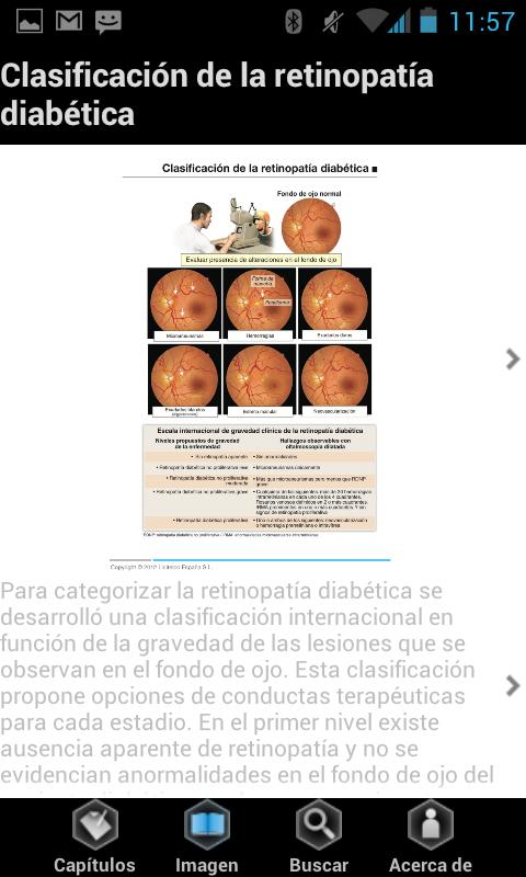 La aplicación retinopatía diabética es una herramienta perfecta para los médicos que traten pacientes que padecen esta grave complicación de la diabetes. Siempre a mano en su teléfono, usted dispondrá de una completa colección de imágenes médicas sobre retinopatía. Rigurosas y de gran calidad visual, le resultarán útiles tanto en su práctica diaria como para su uso en presentaciones con otros colegas. Además la aplicación contiene la opción de editar las imágenes para añadir los comentarios que usted desee.