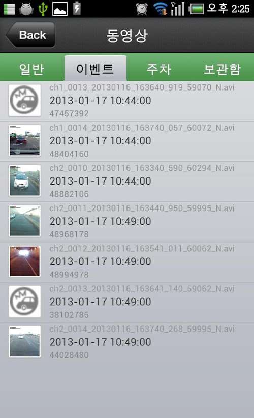 - 이벤트 영상 : 블랙박스에 이벤트시 저장된 영상을 스마트폰에 다운로드 받는다