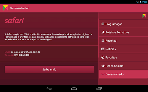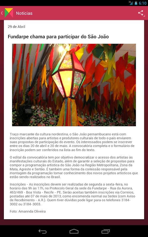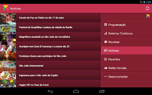 O app PE no São João é um aplicativo voltado para divulgação do São João de Pernambuco. Nele você poderá conferir a programação dos eventos das cidades onde acontece a festa junina, como também os principais pontos turísticos. Receitas com passo a passo da culinária regional e as principais notícias do São João.This app EP in St. John is an application aimed to publicize the São João Pernambuco. There you can check the schedule of events of the cities where is the Jerk, as well as the main sights. Recipes with step by step the regional cuisine and the major news of the St. John