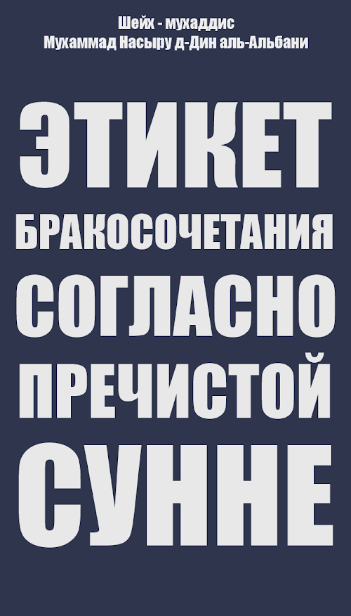 Как известно, существует множество правил этикета бракосочетания. В этой работе я затрагиваю лишь те правила этикета, в отношении которых до нас дошли достоверные хадисы пророка Мухаммада, мир ему и благословение Аллаха, которые нельзя отвергнуть из-за цепочки рассказчиков, а источники, из которых они взяты, нельзя подвергнуть ни малейшему сомнению, чтобы человек, поступающий в соответствии с этими правилами, смог получить ясное представление о данных предписаниях религии и был твёрдо убежден в правильности своих действий. Я надеюсь, что Аллах ниспошлет ему счастье, в воздаяние за то, что он начал супружескую жизнь в полном соответствии с Сунной, и сделает его одним из Своих рабов, которых Он описал словами: «Они говорят: “Господь наш! Даруй нам отраду глаз в наших супругах и потомках и сделай нас образцом для богобоязненных” Сура «аль-Фуркан», 74. Благой исход уготован для богобоязненных, как об этом сообщил Господь миров, сказав: «А богобоязненные, воистину, пребудут среди сеней и источников и плодов, каких только по-желают. Ешьте и пейте во здравие за то, что вы совершали! Так Мы вознаграждаем творящих добро» Сура «аль-Мурсалят», 41 44. Автор "Etiquette marriage according to the sunnah of the Immaculate"