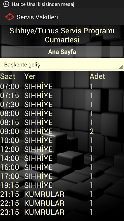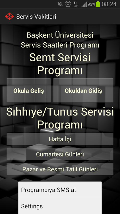 Başkent Üniversitesi'nin servis saatlerini içermektedir. Semt servisleri, Sıhhıye ve Tunus servislerinin hangi günler saat kaçta hangi duraklardan kalkacağı hakkında bilgi verir. Hızlı ve kolay kullanımıyla okulun sitesinden servis programını açmaya çalışırken vakit kaybı artık sonra eriyor.