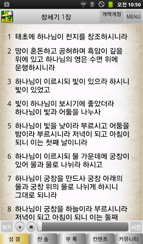 - 개역개정에서는 두가지의 재생형태(입체낭독, 빠른낭독)를 지원 합니다.