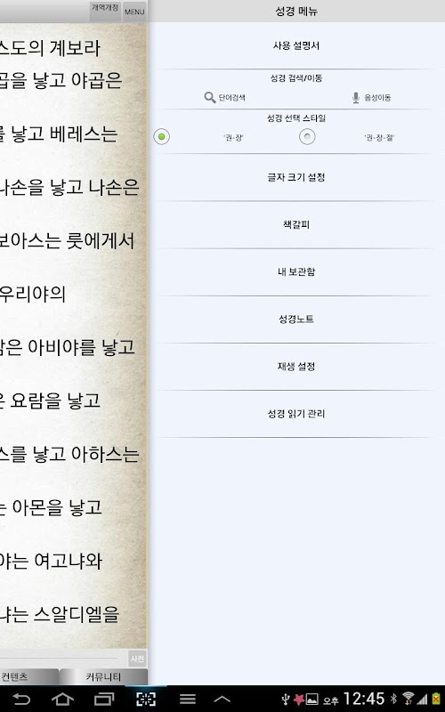 - 텍스트의 크기를 조절할 수 있어서 남녀노소에 관계없이 성경 텍스트를 편하게 볼 수 있습니다.