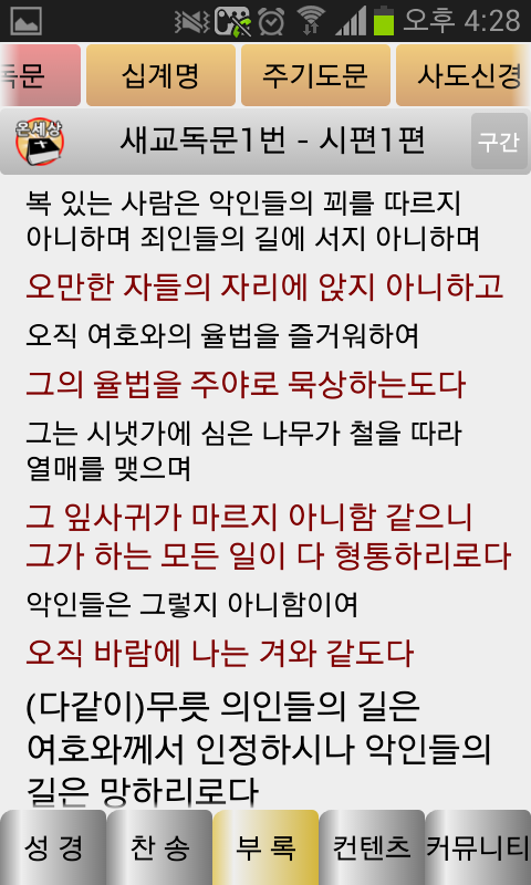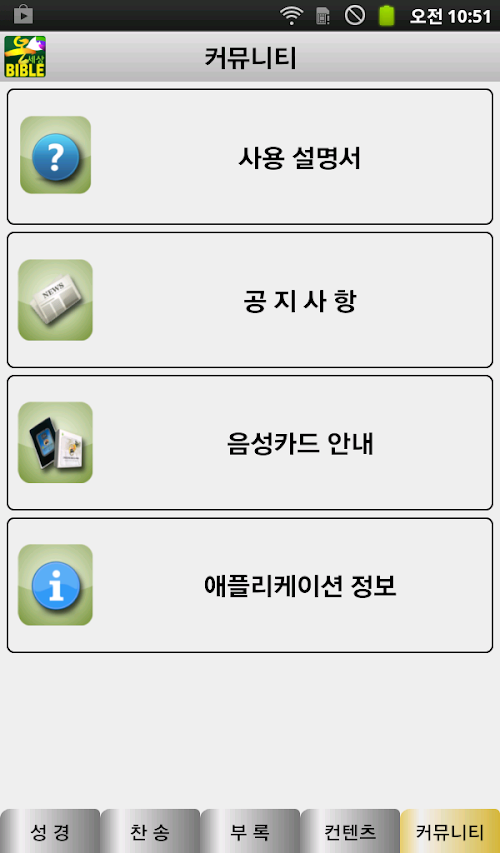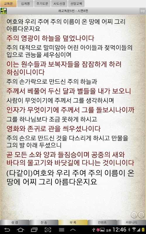 - 성경, 찬송가와 더불어 신앙생활에 필수적인 교독문, 주기도문, 사도신경, 10계명을 함께 제공합니다.