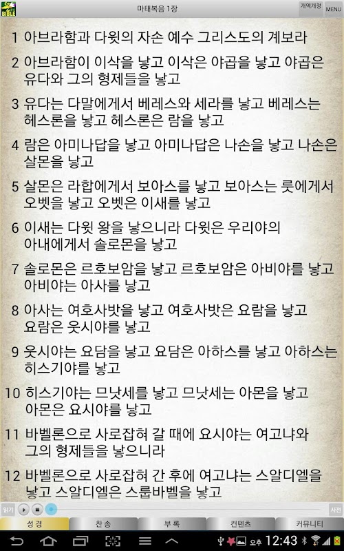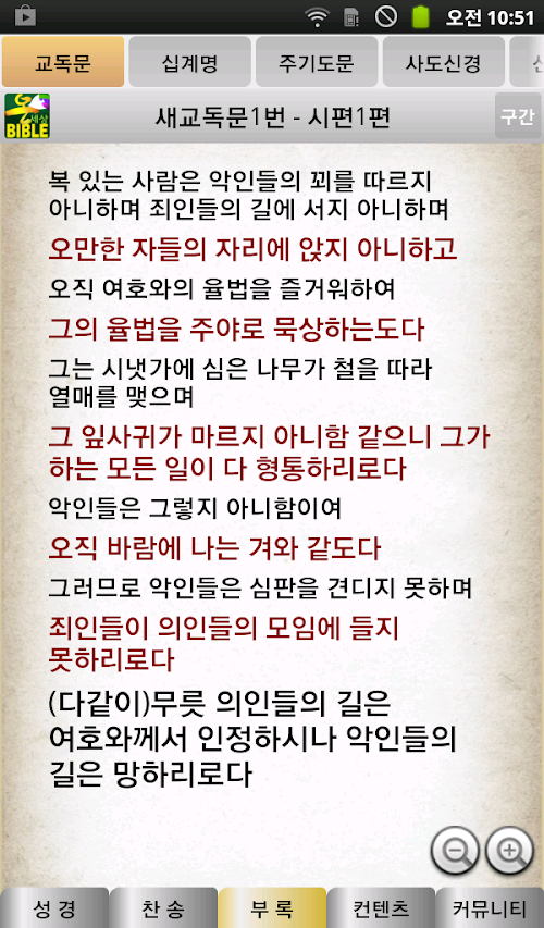 - 텍스트의 크기를 조절할 수 있어서 남녀노소에 관계없이 성경 텍스트를 편하게 볼 수 있습니다.