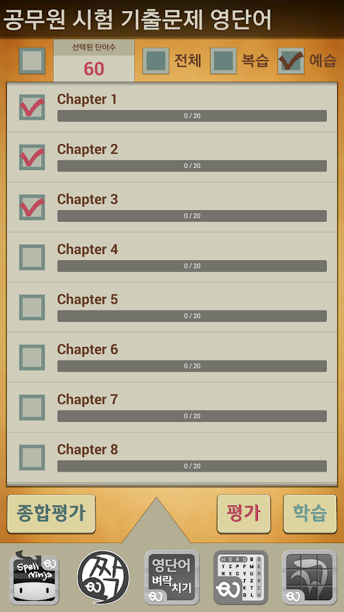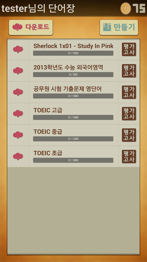 초등영단어, 중등영단어, 고등영단어, 수능, 공무원 영단어, 토익, 토플, 텝스 ... 에다가 영화, 미드 까지 다양한 단어장들은 계속 추가되고 있습니다.