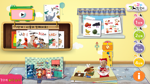 1단계 부터 4단계까지 낱말, 한글자, 낱자, 문장 순으로 순차적으로 언어발달놀이를 할 수 있어요.