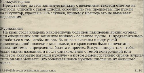 Здесь описаны наиболее популярные советы по пользованию шпаргалок, как лучше их использовать, куда лучше всего их спрятать. Немного примеров из жизни и на практике. Также описываются необычные и очень оригинальные методы скрыть шпаргалку на зачете или экзамене. Очень надеемся что данный материал пригодится студентам и преподавателям :)Here we describe the most popular tips for using cribs how best to use them where best to hide them. A few examples from the life and practice. It also describes a very unusual and original methods to hide cheat sheet on test or examination. Very much hope that this material will be useful to students and teachers :)