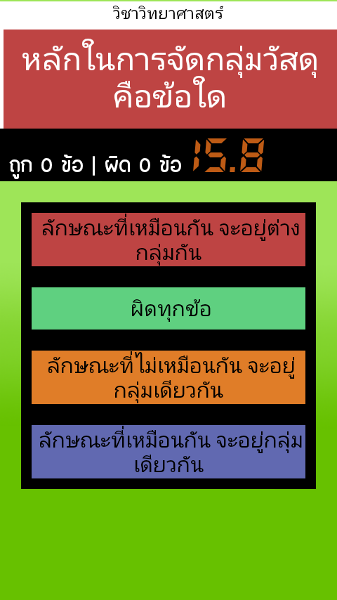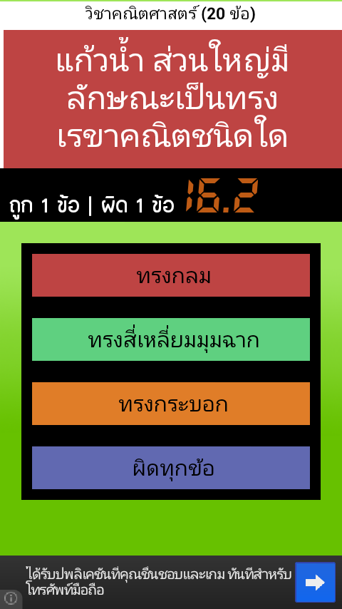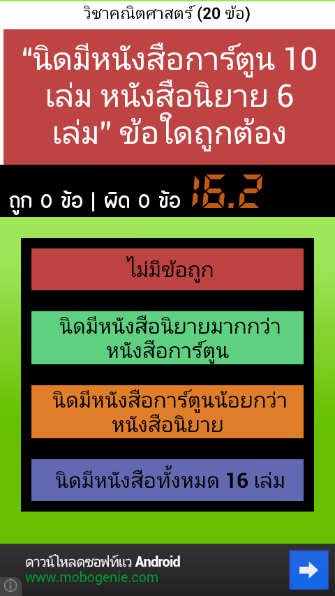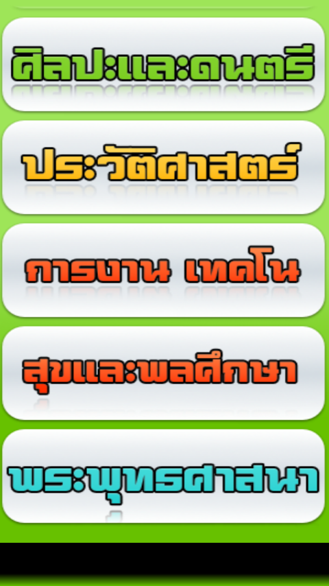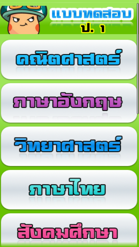 รวมข้อสอบชั้นประถมศึกษาปีที่ 1 แต่ละวิชา จะมีข้อสอบให้ทำ 20 ข้อ (สุ่มมาแบบไม่ซ้ำกันในแต่ละครั้ง) กดเลือกคำตอบที่ถูก ในเวลาที่กำหนด คะแนนจะถูกบันทึก คณิต อังกฤษ ภาษาไทย วิทยาศาสตร์ สังคม พุทธศาสนา การงานและเทคโนโลยี ศิลปะ สุขศึกษา และพลศึกษาOverall exam grade 1, each department will have to make 20 test items (random unique each time), touch the right answer. In due time Points will be added to the language, Mathematics, Science, Social Thailand Buddhist art, health and physical education, and technology.