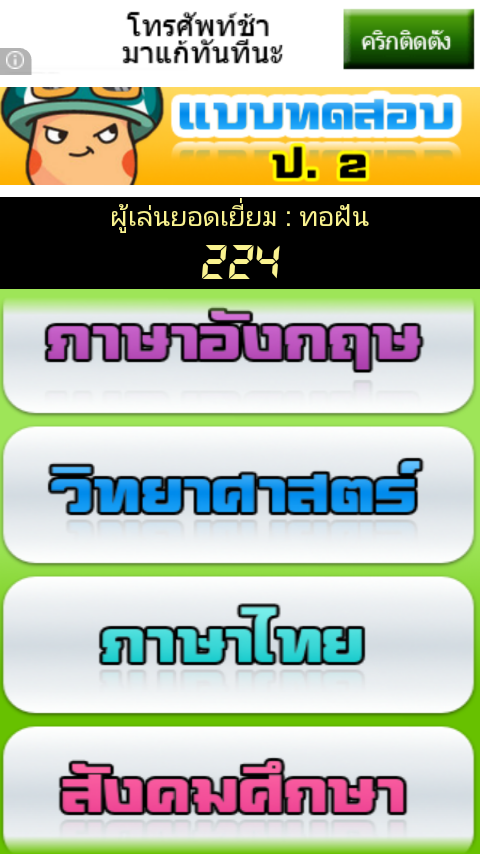 รวมข้อสอบชั้นประถมศึกษาปีที่ 2 แต่ละวิชา จะมีข้อสอบให้ทำ 20 ข้อ (สุ่มมาแบบไม่ซ้ำกันในแต่ละครั้ง) กดเลือกคำตอบที่ถูก ในเวลาที่กำหนด คะแนนจะถูกบันทึก คณิต อังกฤษ ภาษาไทย วิทยาศาสตร์ สังคม พุทธศาสนา การงานและเทคโนโลยี ศิลปะ สุขศึกษา และพลศึกษาOverall test grade 2, each department will have to do a 20-item test (random and unique each time), touch the right answer. In due time Points will be added to the language, Mathematics, Science, Social Thailand Buddhist art, health and physical education, and technology.