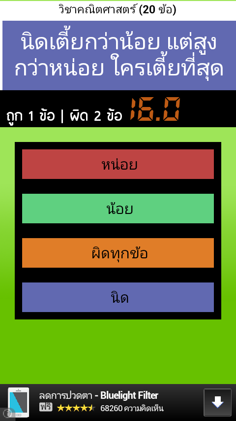 รวมข้อสอบชั้นประถมศึกษาปีที่ 2 แต่ละวิชา จะมีข้อสอบให้ทำ 20 ข้อ (สุ่มมาแบบไม่ซ้ำกันในแต่ละครั้ง) กดเลือกคำตอบที่ถูก ในเวลาที่กำหนด คะแนนจะถูกบันทึก คณิต อังกฤษ ภาษาไทย วิทยาศาสตร์ สังคม พุทธศาสนา การงานและเทคโนโลยี ศิลปะ สุขศึกษา และพลศึกษาOverall test grade 2, each department will have to do a 20-item test (random and unique each time), touch the right answer. In due time Points will be added to the language, Mathematics, Science, Social Thailand Buddhist art, health and physical education, and technology.