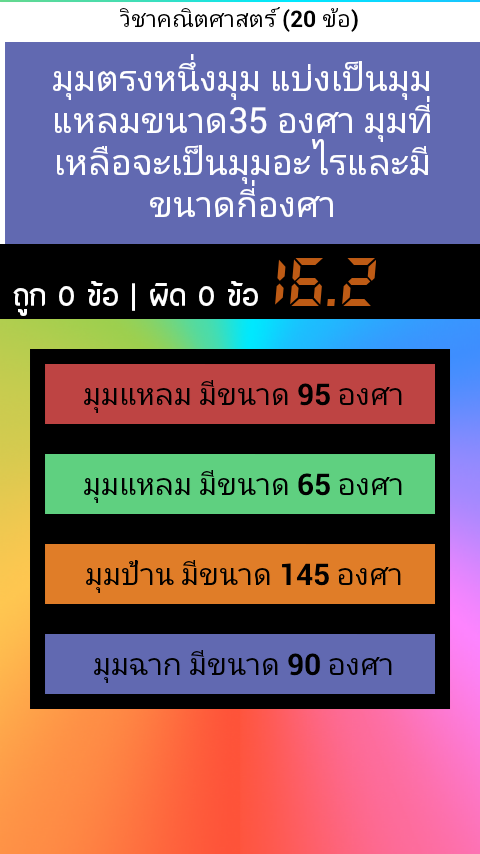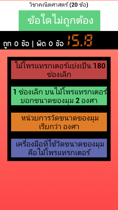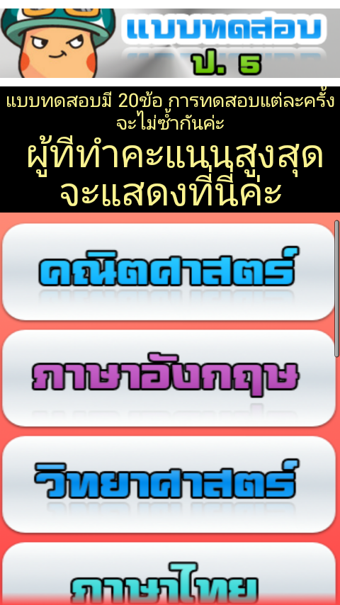 รวมข้อสอบชั้นประถมศึกษาปีที่ 5 แต่ละวิชา จะมีข้อสอบให้ทำ 20 ข้อ (สุ่มมาแบบไม่ซ้ำกันในแต่ละครั้ง) กดเลือกคำตอบที่ถูก ในเวลาที่กำหนด คะแนนจะถูกบันทึก คณิต อังกฤษ ภาษาไทย วิทยาศาสตร์ สังคม พุทธศาสนา การงานและเทคโนโลยี ศิลปะ สุขศึกษา และพลศึกษาOverall test grade 5, each subject will have to do a 20-item test (random and unique each time), touch the right answer. In due time Points will be added to the language, Mathematics, Science, Social Thailand Buddhist art, health and physical education, and technology.