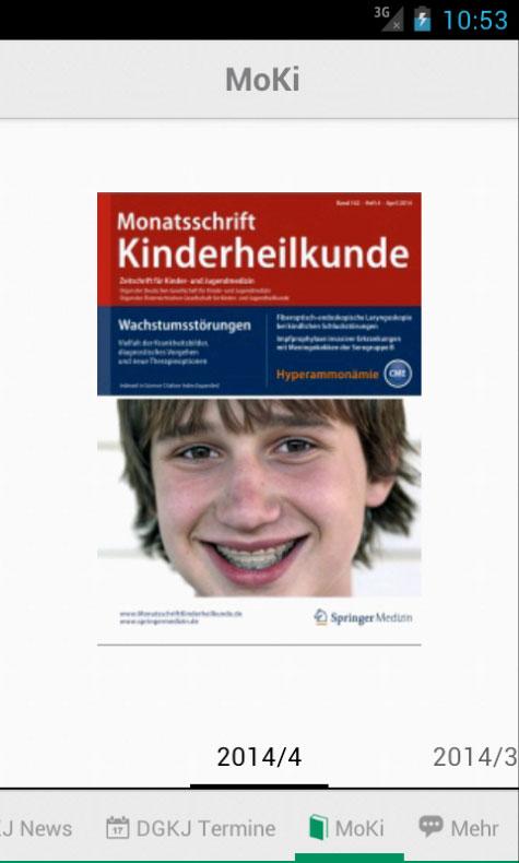 Die Zeitschrift „Monatsschrift Kinderheilkunde“ (Springer Medizin), Organ der DGKJ und ÖGKJ, findet sich unter „MoKi“. Ausgabenweise sind Inhaltsverzeichnis und Abstracts zu lesen. Wer nicht nur die Abstracts, sondern auch die vollständigen Artikel sehen möchte, benötigt ein entsprechendes Abonnement. Hilfestellung bietet: [email protected].