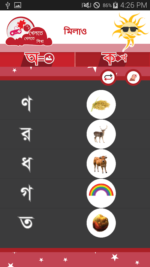 6) খেলতে খেলতে শিখা (Learning While at Play) – Arranging alphabets, numbers in order and matching with right images (Samsung device only)