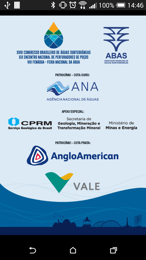 A VIII FENÁGUA acontecerá simultaneamente com o XVIII Congresso Brasileiro de Águas Subterrâneas e XIX Encontro Nacional de Perfuradores de Poços, no período de 14 à 17 de Outubro de 2014, no MINASCENTRO em Belo Horizonte-MG. Uma ênfase especial está sendo dada à organização dos três eventos simultâneos, de modo a viabilizar múltiplas maneiras de interação entre os participantes do Congresso, representados por engenheiros, geólogos, hidrogeólogos, cientistas, professores, consultores, autoridades ambientais, gestores públicos, estudantes e demais profissionais envolvidos com as questões de águas subterrâneas, e o público representado pelos empresários do setor de perfuração de poços e expositores da Feira e do Encontro. Para isso, além das conferências, mesas redondas e apresentação de trabalhos técnicos e científicos, programados para o Congresso, também serão desenvolvidas atividades especificamente voltadas para os perfuradores de poços e para os expositores, com o objetivo de aumentar a visibilidade destes grupos para todos os demais participantes, incrementando as oportunidades de interação profissional, de contatos técnicos, de transferência de informações e de realização de negócios.The VIII FENÁGUA happen simultaneously with the XVIII Brazilian Congress on Groundwater and XIX National Meeting of punches Wells, in the period from 14 to 17 October 2014, in MINASCENTRO in Belo Horizonte-MG. A special emphasis is being given to the organization of three simultaneous events, in order to allow multiple ways of interaction among participants of the Congress, represented by engineers, geologists, hydrogeologists, scientists, teachers, consultants, environmental officials, public administrators, students and other professionals involved with the issues of groundwater, and the public represented by businessmen in the drilling of wells and the Fair exhibitors and meeting industry. For this, in addition to conferences, roundtables and presentation of technical and scientific works, scheduled to Congress also specifically geared to the well drillers for exhibitors and activities will be developed, with the aim of increasing the visibility of these groups for all other participants, increasing the opportunities for professional interaction, technical contacts, transfer of information and conducting business.