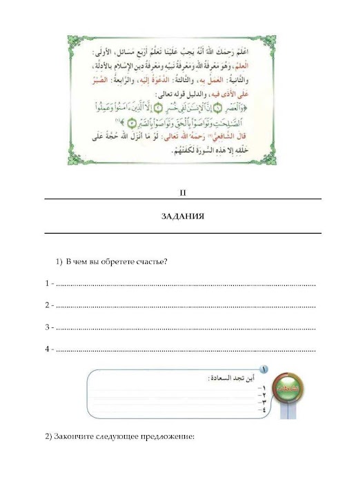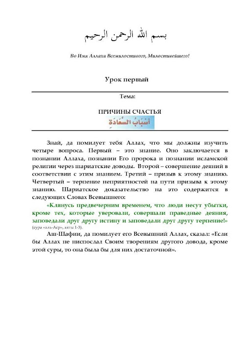 This manual is dedicated to the main and most important pillar of Islam - monotheism. The uniqueness and novelty of the benefits is that for the first time in Russian it is addressed to children and their parents. The purpose of benefits, calculated for six years of study lies in the formation of the children the basics of Tawheed and creed. Structurally, each book allowance consists of lessons, containing the main text of the topic, thesaurus, comments, practical exercises and tasks for repetition. Since the Russian translation accompanied by a parallel Arabic text, manual material can be used to study the Arabic language as a system of additional training, or independently.