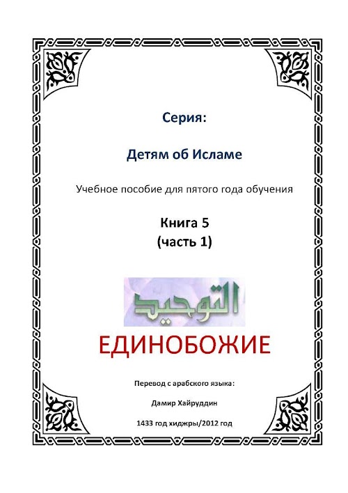 Настоящее учебное пособие посвящено главному и важнейшему столпу Ислама — единобожию. Уникальность и новизна пособия состоит в том, что впервые на русском языке оно адресовано детям и их родителям. Цель пособия, рассчитанного на шесть лет обучения, заключается в формировании у детей основ единобожия и вероубеждения. Структурно каждая книга пособия состоит из уроков, содержащих основной текст рассматриваемой темы, тематический словарь, комментарии, практические упражнения и задания для повторения. Поскольку перевод на русский язык сопровождается параллельным арабским текстом, материал пособия может быть использован для изучения арабского языка как в системе дополнительного обучения, так и самостоятельно.The name of Allah the merciful, who has mercy!