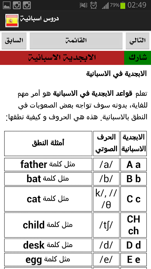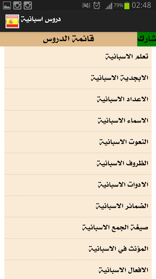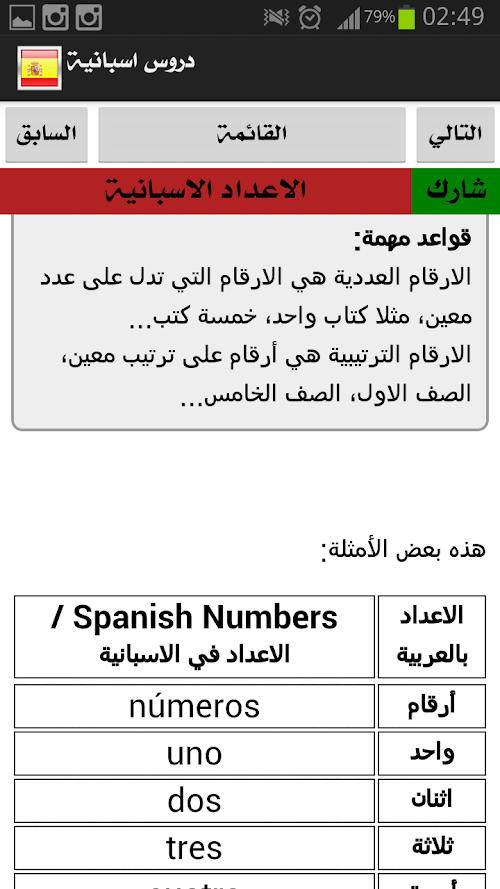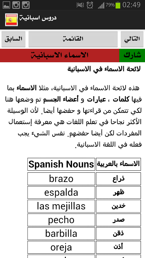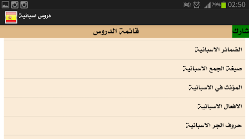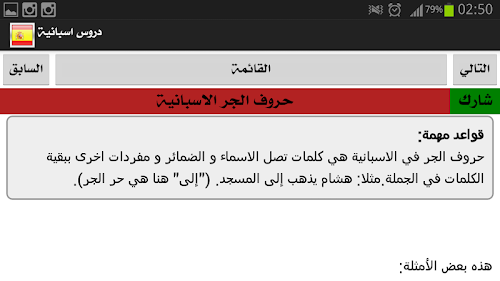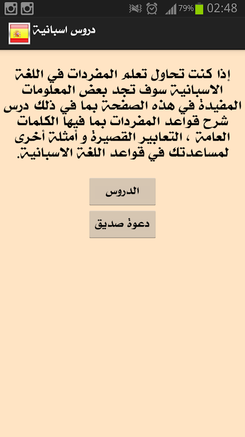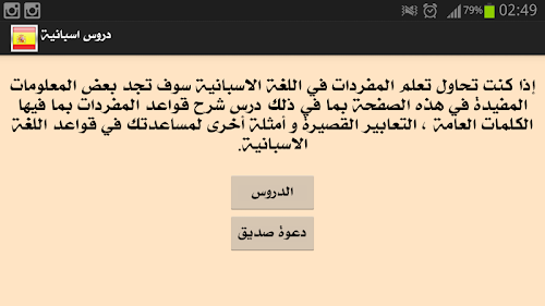 إذا كنت تحاول تعلم المفردات في اللغة الاسبانية سوف تجد بعض المعلومات المفيدة في هذه التطبيق بما في ذلك درس شرح قواعد المفردات بما فيها الكلمات العامة ، التعابير القصيرة و أمثلة أخرى لمساعدتك في قواعد اللغة الاسبانية.If you are trying to learn vocabulary in Spanish you will find some useful information in this application, including a lesson to explain the rules of vocabulary words, including general, short phrases and examples to help you in the rules of the Spanish language.