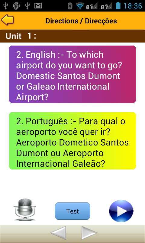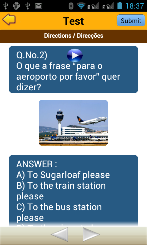 - O app tem um teste onde você pode ouvir e ler e selecionar a resposta correta.